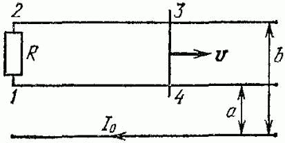 Имеется бесконечный прямой провод, по которому течет ток силы I0. На расстояниях a и b от него расположены два параллельных ему неизолированных провода, закороченных на одном конце сопротивлением R. Все три провода лежат в одной плоскости. По закороченным сопротивлением проводам скользит со скоростью v замыкающий их стержень 3—4. Определить: а) силу I и направление тока в контуре 1—2—3—4, б) силу F, необходимую, чтобы поддерживать постоянной скорость стержня 3—4, и расстояние х0 от провода с током I0 до точки, в которой нужно приложить эту силу, чтобы стержень двигался поступательно, в) мощность Р, затрачиваемую на перемещение стержня. Сопротивлением проводов, стержня и контактов в точках 3 и 4 пренебречь.