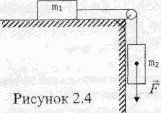 Вычислите ускорения тел и силу натяжения нити (рисунок 2.4). Нить невесомая, нерастяжимая, блок невесомый, m1 = 1 кг, m2 = 2 кг, коэффициент трения первого тела о поверхность μ = 0,1, внешняя сила F = 10 Н.