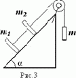 В установке, изображенной на рисунке, известен угол α, массы m, m1, m2, коэффициент трения ? между плоскостью и грузом. Определить: ускорение груза m2, силу натяжения Fн2 нити между грузами m1 и m2; силу Fбл, с которой блок действует на ось. Массой блока и нитки пренебречь. Учитывать, что m > (m1 + m2) sinα.