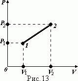 Воздух, масса которого m = 116 г, сжимают так, что его объем изменяется пропорционально давлению (рис. 13). При этом давление возрастает от 200 до 400 кПа. Определить коэффициент пропорциональности изменения объема в зависимости от давления, если во время процесса газ получил 80 кДж теплоты. Вычислить температуру Т в начальной 1 и конечной 2 точках процесса.