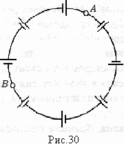 Источники тока с различными ЭДС соединены, как показано на рис 30. Электродвижущая сила источников пропорциональны их внутренним сопротивлениям ε = αr, где α — постоянная. Сопротивлением проводников пренебречь. Определить ток I в цепи и разность потенциалов между точками А и В.