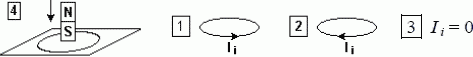 Постоянный магнит южным полюсом приближают к проводящему контуру, расположенному перпендикулярно к плоскости рисунка. В каком направлении будет протекать индукционный ток Ii в контуре? Укажите номер правильного ответа и поясните свой выбор.