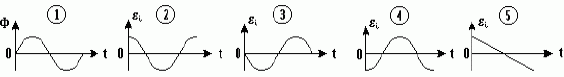 Магнитный поток Ф, сцепленный с проводящим контуром, изменяется со временем так, как показано на рисунке на графике под номером 1. Укажите номер графика, соответствующего зависимости от времени ЭДС индукции εi, возникающей в контуре. Поясните свой выбор. |