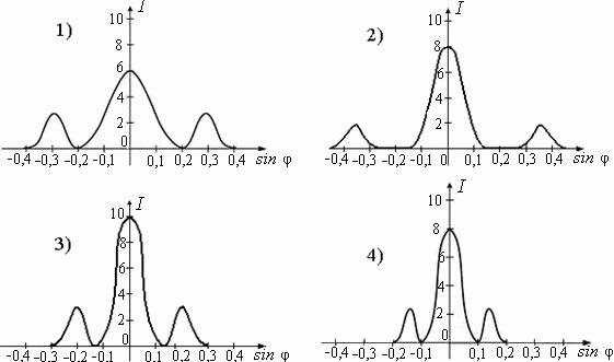 Одна и та же дифракционная решетка освещается различными монохроматическими излучениями с разными интенсивностями. Случаю освещения светом с наибольшей частотой (I – интенсивность света, φ – угол дифракции) соответствует рисунок под номером ...