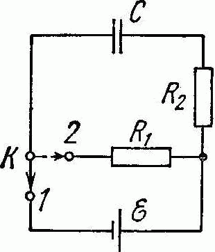 Конденсатор емкости С = 5,00 мкФ подключили к источнику постоянной э. д. с. ε = 200 B (см. рис.). Затем переключатель К перевели с контакта 1 на контакт 2. Найти количество тепла, выделившееся на сопротивлении R1 = 500 Ом, если R2 = 330 Ом.
