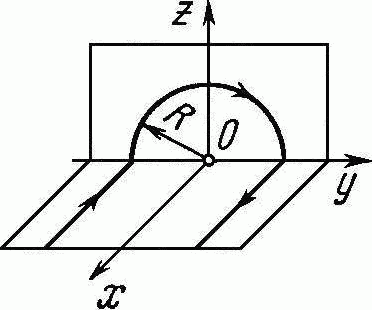 Найти индукцию магнитного поля в точке О, если проводник с током I = 8,0 А имеет вид, показанный на рисунке. Радиус изогнутой части проводника R = 100 мм, прямолинейные участки проводника очень длинные.