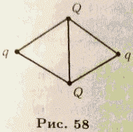 Четыре положительных заряда связаны пятью нитями (см. рис. 58). Длина каждой нити l. Определить силу натяжения нити, связывающей заряды Q между собой (Q > q).