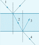 Естественный луч света падает на плоскопараллельную стеклянную пластинку под углом полной поляризации (см. рисунок). При этом интенсивность отраженного света составляет 30% от интенсивности падающего света. Найти степень поляризации преломленного луча 2. Поглощением света пренебречь. Показатель преломления стекла принять равным 1,5.
