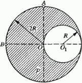 В шаре радиуса 2R, несущем равномерно распределенный заряд с объемной плотностью ρ = 10 мкКл/м3, сделан сферический вырез радиусом R. Используя теорему Остроградского-Гаусса и принцип суперпозиции ацентрических полей, найти напряженность Е поля в точках О, А и В. Радиус R = 10 см.