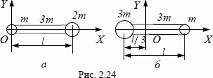 На рисунке 2.24 изображен тонкий однородный стержень, на концах которого прикреплены маленькие шарики. Массы стержня и шариков указаны на рисунке. Определить координату хс центра масс такой системы в случаях а и б. Длину l стержня принять в обоих случаях равной 1,2 м. Шарики рассматривать как материальные точки.