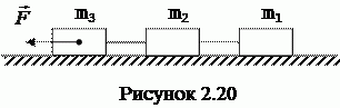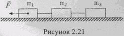Вычислите ускорения тел и силы натяжения нитей (рисунок 2.20). Нити невесомые и нерастяжимые, m1 = 1 кг, m2 = 2 кг, m3 = 3 кг, внешняя сила F = 15 Н, коэффициенты трения тел о поверхность μ1 = μ2 = μ3 = 0,1.