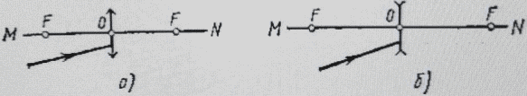 На тонкую линзу падает луч света. Найти построением ход луча после преломления его линзой: а) собирающей (рисунок к задаче, а); б) рассеивающей (рисунок к задаче, б). На рисунке: О — оптический центр линзы; F — главный фокус.