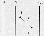 Электростатическое поле образовано тремя параллельными бесконечными заряженными плоскостями. Плоскости зарядов указаны на рисунке. Чему равна разность потенциалов φ1–φ2 двух точек, расстояние между которыми равно d, а соединяющий их отрезок составляет с вертикалью угол 45°?