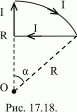 По контуру, изображенному на рис.17.18, идет ток силои? I = 100 А. Определить магнитную индукцию В поля, создаваемую этим током в точке О. Радиус изогнутои? части контура равен R = 20 см (О — центр кривизны контура), а угол α = 60°.