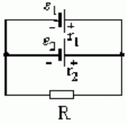 В схеме ε1 и ε2 — два элемента с равными э.д.с. 2 В. Внутренние сопротивления этих элементов равны соответственно r1 = 1 Ом и r2 = 2 Ом. Чему равно внешнее сопротивление R, если сила тока I1, текущего через ε1, равна 1 А? Найти силу тока I2, идущего через ε2. Найти силу тока IR, идущего через сопротивление R.