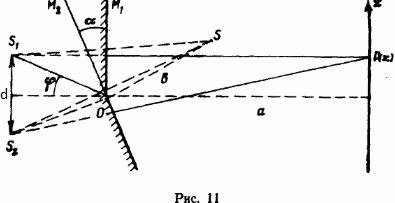 Определить угол α между зеркалами Френеля (рис. 11), если расстояние Δx между полосами интерференции на экране равно 1 мм, а = 1 м, b = 10 см, λ = 4861 А.