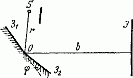 В изображенной на рисунке установке с бизеркалами Френеля S - источник света в виде перпендикулярной к плоскости рисунка щели. Э — экран. Расстояние r = 0,100 м, b = 1,00 м. Определить значение угла φ, при котором для λ = 500 нм ширина интерференционных полос на экране Δx = 1,00 мм. Ответ выразить в минутах.