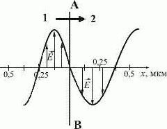 На рисунке представлена мгновенная фотография электрической составляющей электромагнитной волны, переходящей из среды 1 в среду 2 перпендикулярно границе раздела сред АВ. Отношение скорости света в среде 2 к его скорости в среде 1 равно ... .