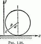 Кольцо радиусом R катится без проскальзывания по горизонтальной поверхности с угловой скоростью ω. Найти зависимость координат некоторой точки А кольца (рис. 1.24) от времени, если в начальный момент хА = 0, уА = 0, α = 0.