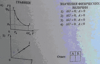 Установите соответствие между графиками процессов, в которых участвует 1 моль идеального газа, и значениями физических величин, характеризующих эти процессы (ΔU — изменение внутренней энергии; A — работа газа). К каждой позиции первого столбца подберите соответствующую позицию из второго столбца и запишите в таблицу выбранные цифры под соответствующими буквами.