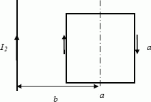 Квадратная рамка с током I1 = 2 А расположена в одной плоскости с длинным прямым проводом, по которому течет ток I2 = 30 А. Проходящая через середины противоположных сторон ось рамки параллельна проводу и отстоит от него на расстоянии b = 3 см (рис. 93). Сторона рамки а = 2 см. Найти работу, которую надо совершить, чтобы повернуть рамку вокруг ее оси на 180°.