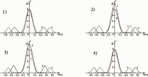 На дифракционную решетку падает излучение одинаковой интенсивности с частотами ν1 и ν2. Укажите номер рисунка, иллюстрирующего положение главных максимумов, создаваемых дифракционной решеткой, если ν1 > ν2? (J — интенсивность, φ — угол дифракции).