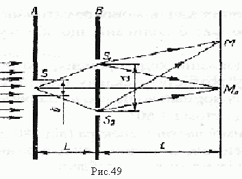 Определить длину световой волны λ0, если в опыте Юнга (рис. 49) расстояние от третьего интерференционного максимума к центральной полосы xmax = 1,65 мм, расстояние между щелями d = 1 мм, экран расположен на расстоянии l = 1 м от щелей.