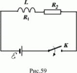 Катушку индуктивностью L = 0,4 Гн и сопротивление R1 = 0,3 Ом в некоторый момент времени подключают к источнику, ЭДС которого равна 12 В, через резистор сопротивлением R2 = 2,7 Ом (рис. 59). Определить напряжение на сопротивлении R2 через 0,1 с. Внутренним сопротивлением источника пренебречь.