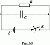 Конденсатор с электроемкостью С = 10 мкФ и резистор сопротивлением R = 1200 Ом соединены параллельно и подключены к источнику, ЭДС которого равна 36 В, через ключ К (рис. 60). В некоторый момент времени ключ К размыкают. Определить заряд на конденсаторе через 0,01 с. Внутренним сопротивлением источника пренебречь.