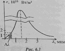 На рис. 6.3 представлена кривая распределения спектральной плотности энергетической светимости (излучательной способности), абсолютно чёрного тела. Используя график, определить температуру тела и долю излучаемой энергии, приходящуюся на диапазон длин волн видимого света Δλ (от 0,4 до 0,75 мкм).