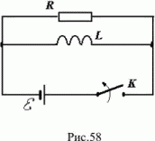 Электрическая цепь (см. рис. 58) состоит из катушки с индуктивностью L = 0,25 Гн и резистора сопротивлением R = 8,0 Ом, которые соединены параллельно и подключены к источнику ЭДС через ключ К. В некоторый начальный момент времени ключ К размыкают. Определить величину тока в резисторе R через 1 с. Величина ЭДС источника равна 12 В, внутреннее сопротивление источника r = 1 Ом.