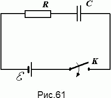 Конденсатор с электроемкостью С = 10,5 мкФ и резистор сопротивлением R = 500 Ом (соединенные последовательно) в некоторый момент времени подключают к источнику, ЭДС которого равна 80 В (рис. 61). Определить энергию поля в конденсаторе через 0,01 с. Внутренним сопротивлением источника пренебречь.
