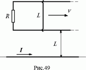 По длинному прямому проводу пропускают ток силой I = 10 А. На расстоянии L и 2L от него расположены два параллельных ему провода, замкнутых на одном конце сопротивлением R = 1 Ом (рис.49). По проводам перемещают стержень-перемычку с постоянной скоростью V = 1 м/с. Найти значение индуцируемого тока.