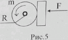 К вращающемуся диску массой m = 40 кг и диаметром D = 30 см прижимается тормозная колодка (рис.5) с силой F = 20 H, в результате чего диск останавливается в течение времени t = 15 с. Коэффициент трения μ = 0,4. Найти начальную частоту ν0 вращения диска.