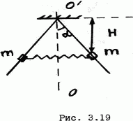 Две штанги, ОА и ОВ, закреплены под углом α = 30° к вертикальной оси OO' (рис. 3.19). Ось и штанги расположены в одной плоскости. На каждую штангу надета муфта массой m = 10 г. Муфты соединены пружинами и находятся на одной высоте. Длина пружины в недеформированном состоянии l0 = 20 см, жесткость — k = 0,65 Н/м. Система вращается вокруг оси OO' с постоянной угловой скоростью ω = 5,48 с–1. Определить положение равновесия муфт (высоту H). Трение не учитывать.