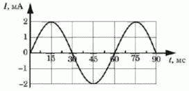 На графике показана зависимость от времени силы переменного электрического тока I, протекающего в катушке с индуктивностью L = 5 мГн. Чему равно ЭДС самоиндукции в момент времени t = 40 мс?