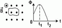С проводящим контуром, расположенным в плоскости чертежа, сцеплен магнитный поток, изменяющийся со временем t согласно графику, приведенному на рисунке. Укажите сумму номеров правильных утверждений. 1) В контуре возникает индукционный ток, текущий в интервале времени 0 < t < t1 по часовой стрелке. 2) В момент времени t = t1 ЭДС индукции в контуре равна нулю. 4) В момент времени t = t2 ЭДС индукции в контуре равна нулю. 8) В контуре возникает индукционный ток, текущий в интервале времени t1 < t < t2 по часовой стрелке.