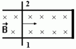 Два рельса замкнуты на конце проводником (см. рисунок, вид сверху). Другой проводник, параллельный ему и имеющий с рельсами надежный контакт в точках 1 и 2, скользит по ним с постоянной скоростью в магнитном поле, вектор индукции которого В. Как направлен индукционный ток на участке цепи 1—2 и каково соотношение потенциалов в точках 1 и 2? 1) От 2 к 1, φ2 > φ1 2) От 1 к 2, φ2 > φ1 3) От 2 к 1, φ1 > φ2 4) От 1 к 2, φ1 > φ2