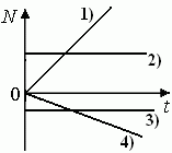 На рисунке представлены графики зависимости мощности N постоянного момента силы от времени t. Тело вращается равнозамедленно. Какой график соответствует этому случаю?