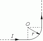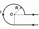 Ток I = 5 А течет по тонкому проводнику, изогнутому так, как показано на рисунке. Радиус изогнутой части проводника R = 12 см. Определить индукцию магнитного поля в точке О.