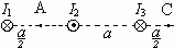 По трем бесконечно длинным параллельным проводникам, расстояние между которыми а = 10 см, текут токи I1 = 5 A, I2 = 10 А и I3 = 5 A. Направления токов в сечениях проводника показаны на рисунке. Определите индукцию магнитного поля B в точках А, удаленной на а/2 от первого провода, и в точке С, удаленной на а/2 от третьего провода.