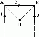 Тонкий бесконечно длинный проводник с током I = 10 А согнут так, как показано на рисунке. Участок проводника АВ = а = 10 см. Определите индукцию В магнитного поля в точке О, находящейся на пересечении биссектрис прямых углов.