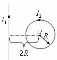 Вычислить модуль индукции результирующего магнитного поля, созданного токами I1 и I2, текущими по прямому бесконечно длинному проводнику и круговому контуру радиуса R = 20 см в точке O (см. рисунок). Круговой контур и точка O лежат в плоскости чертежа; направление токов указано на рисунке, причем I1 = I2 = 10 А.