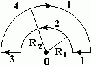 По плоскому контуру из тонкого провода течет ток силой I = 10,0 А. Радиусы полуокружностей равны R1 = 0,10 м и R2 = 0,20 м (см. рисунок). Определите в точке O индукции магнитного поля В1, В2, В3, В4 и В, создаваемые участками 1, 2, 3, 4 и всем контуром.