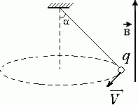 Шарик массой m = 10 г и зарядом q = 5·10–2 Кл, подвешенный на невесомой нерастяжимой нити, равномерно вращается по окружности в горизонтальной плоскости (см. рисунок). Найти радиус окружности, если скорость шарика v = 1 м/с. Учесть, что имеется однородное магнитное поле с индукцией В = 1 Тл, линии которого направлены вертикально вверх. Угол α = 45°.