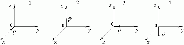 В упругой среде распространяется плоская монохроматическая волна. Ниже под номерами 1, 2 изображены направления вектора скорости v поперечной волны, а под номерами 3, 4 – направления вектора скорости v продольной волны. В каких случаях колебания частиц среды могут происходить вдоль оси 0у? Укажите номера этих диаграмм.