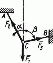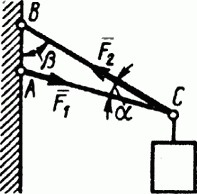 Груз удерживается в равновесии двумя стержнями АС и ВС, шарнирно соединенными в точках А, В и С Стержень ВС растянут силой F2 = 45 Н, а стержень АС сжат силой Ft = 17 Н. Определить вес груза, если заданы углы а = 15° и β = 60°.