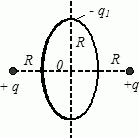 На рисунке изображена система, находящаяся в равновесии: кольцо с равномерно распределенным зарядом –q1 и два точечных заряда +q. Расстояние зарядов +q до центра 0 кольца, равно его радиусу R. Каково отношение величин зарядов q/q1? 1) ; 2) 2 ; 3) 1 ; 4) .