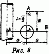 Бесконечная равномерно заряженная нить и шар расположены, как показано на рис. 8. Заряд шара 10–9 Кл; линейная плотность заряда на нити 5·10–10 Кл/см; а = 10 см. Окружающая среда — воздух. Определить: напряженность поля в точках A и В; работу перемещения заряда 10–8 Кл из точки А в точку В. Считать, что расположение зарядов не нарушено взаимодействием. |