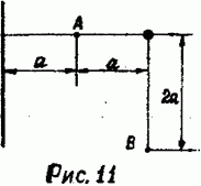 Бесконечно большая равномерно заряженная плоскость и параллельная ей длинная нить расположены, как показано на рис. 11 (перпендикулярно плоскости чертежа); а = 20 см; поверхностная плотность заряда плоскости 10–6 Кл/м2; линейная плотность заряда нити 10–6 Кл/м. Определить: напряженность поля в точках A и В; работу перемещения заряда 10–7 Кл из точки A в точку В. Считать, что распределение зарядов не нарушено взаимодействием. |
